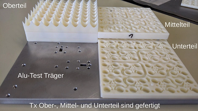 Development of a modular planar antenna aperture consisting of 15 Tx and 8 Rx modules (dimensions: 110 × 30 cm), manufactured using injection molding and galvanic metallization. The active Rx aperture enables electronic beamforming and beam steering via adjustable phase shifting.Mechanics & Integration